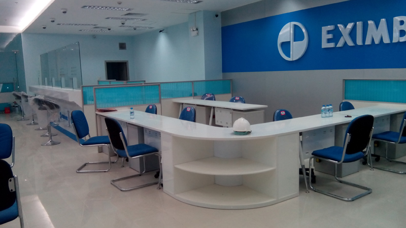 Mô tả: Nội thất hệ thống văn phòng làm việc Ngân hàng Eximbank Bình Dương bao gồm đầy đủ các hạng mục: quầy lễ tân, bàn làm việc, khu vực phòng giám đốc, bàn ghế nhân viên làm việc, được thiết kế hiện đại, nội thất sang trọng tạo không gian làm việc chuyên nghiệp.