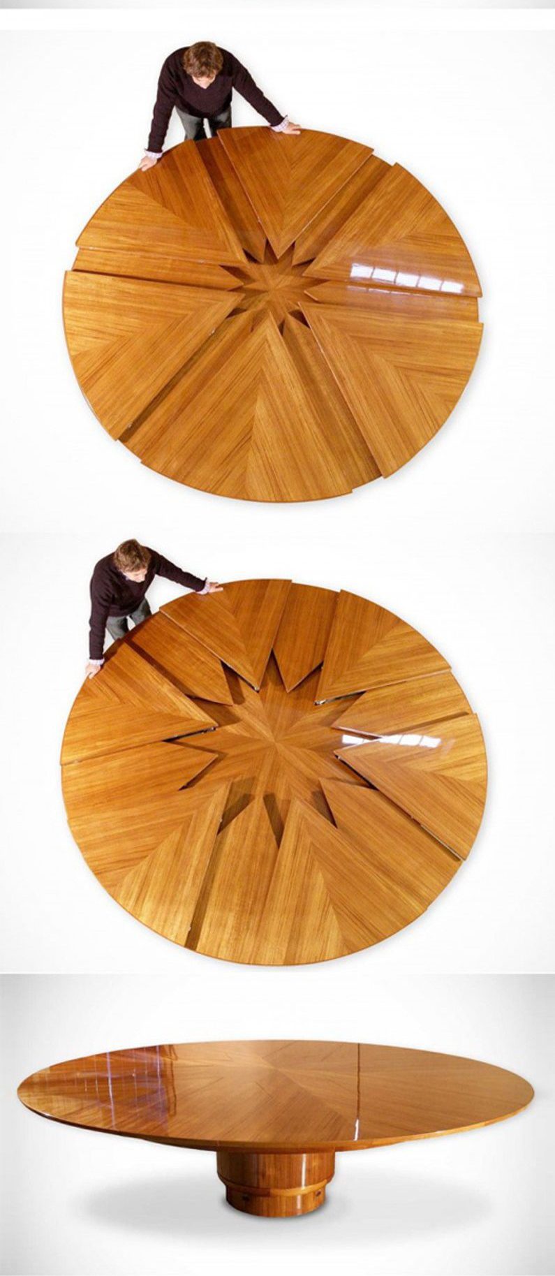 Bàn ăn hình tròn mang lại cảm giác ấm cúng hơn so với các kiểu bàn hình vuông hay chữ nhật. Các mẫu bàn tròn thông thường chỉ có thể gấp ở phần đế bàn. Sau đó cất đi để tiết kiệm diện tích. Nhưng mẫu bàn tròn thông minh ban đầu rất bé nhỏ. Và có thể mở rộng hẳn được phần mặt bàn.