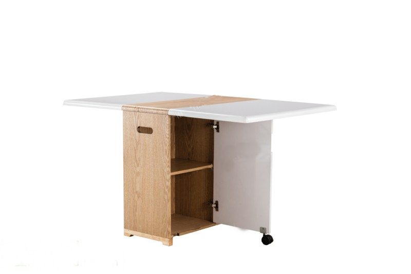 Mẫu bàn ăn thông minh dành cho nhà nhỏ được thiết kế với một bộ khung ở chính giữa được gọi là kệ ăn. Bao gồm hai giá đỡ hai bên tạo độ chắc chắn trong quá trình sử dụng. Bên trong với ngăn bàn ba tầng chứa đồ đạc vô cùng tiện lợi. Hai cánh cửa bàn ăn được thiết kế bo viền chắc chắn và giữ 2 cánh bàn. Giúp thoải mái nâng và gấp cánh một cách dễ dàng khi sử dụng.