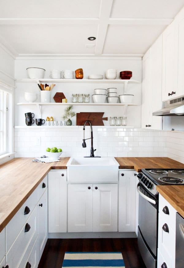 Ngoài việc sử dụng những thiết kế kiểu tủ bếp nhỏ gọn, chúng ta có thể tận dụng tối đa không gian sử dụng của căn bếp. Cụ thể như tận dụng khoảng trống giữa trần nhà làm tủ bếp trên cao hơn có thể chứa đựng được nhiều đồ hơn. Với những bức tường vô tri vô giác chúng ta cũng có thể tận dụng nó và gắng thêm 1 vài tấm đợt để đồ, trung bày đồ vật trang trí….