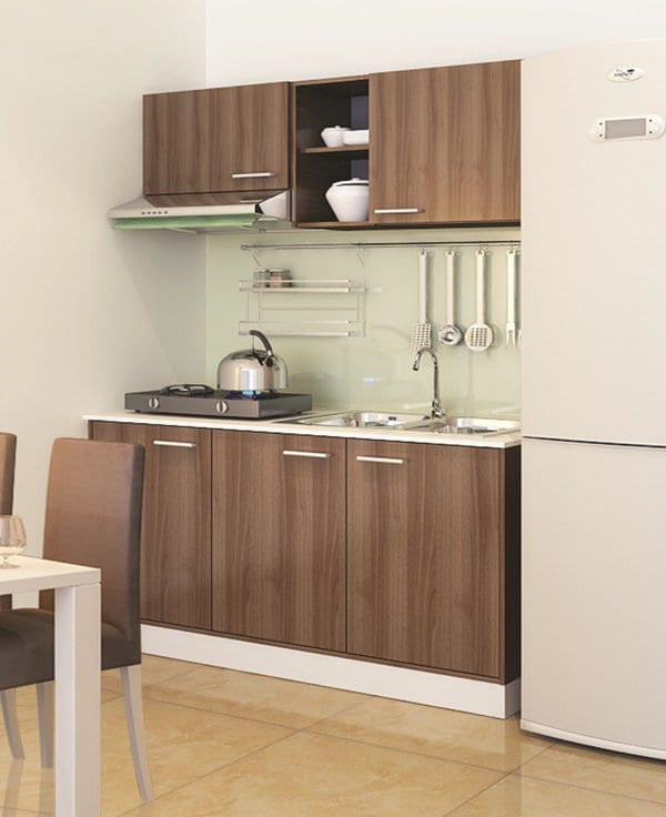 Tủ bếp thông minh đẹp chữ I nhỏ gọn với thiết bị bếp gọn gàng ngăn nắp, với chiếc bếp ga âm, lò nướng âm tủ bếp đẹp tiện dụng. Ngoài ra chúng ta còn có thể sử dụng bếp hồng ngoại, bếp ga mini tiết kiệm diện tích nấu nướng – Mẫu 04