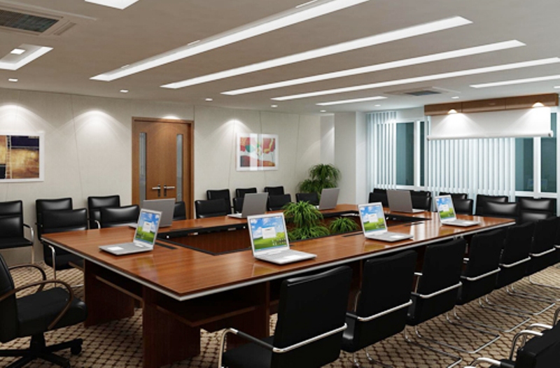 Trong bất kì doanh nghiệp nào thì yếu tố sáng tạo, luôn đi đầu biểu tượng mới là điều mà các thành viên doanh nghiệp quan tâm. Do đó thiết kế phòng họp của doanh nghiệp đã được cách điệu bởi những đường nét rất là độc đáo để thể hiện cái “chất” của Chủ nhà nó. Điểm nhấn táo bạo của nội thất phòng họp này tọa lạc ngay sự tương phản giữa đèn trần và lòng bàn phản chiếu lên cây xanh, không những thế là sự kết hợp tuyệt vời giữa bàn ghế và tấm thảm xanh hài hòa đẹp mắt.