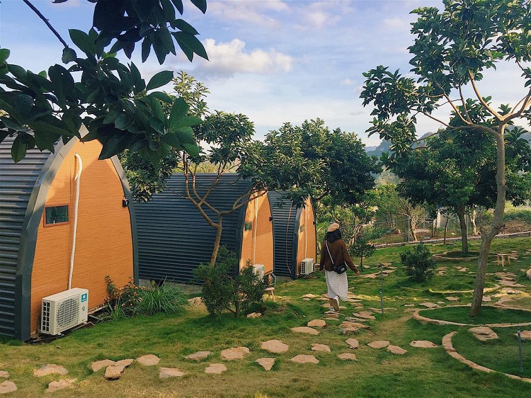 Bao quanh Homestay này là những ruộng ngô, vườn nhãn, hoa hướng dương nở rộ, vàng tươi. Không khí trong lành, thiên nhiên tươi mát, êm đềm. Đây thực sự là nơi bạn có thể nghỉ ngơi thư giãn, hòa mình cùng thiên nhiên. Góp phần vào cảnh vật này là những ngôi nhà gỗ Homestay được xây dựng bằng gỗ với mái vòm độc đáo.